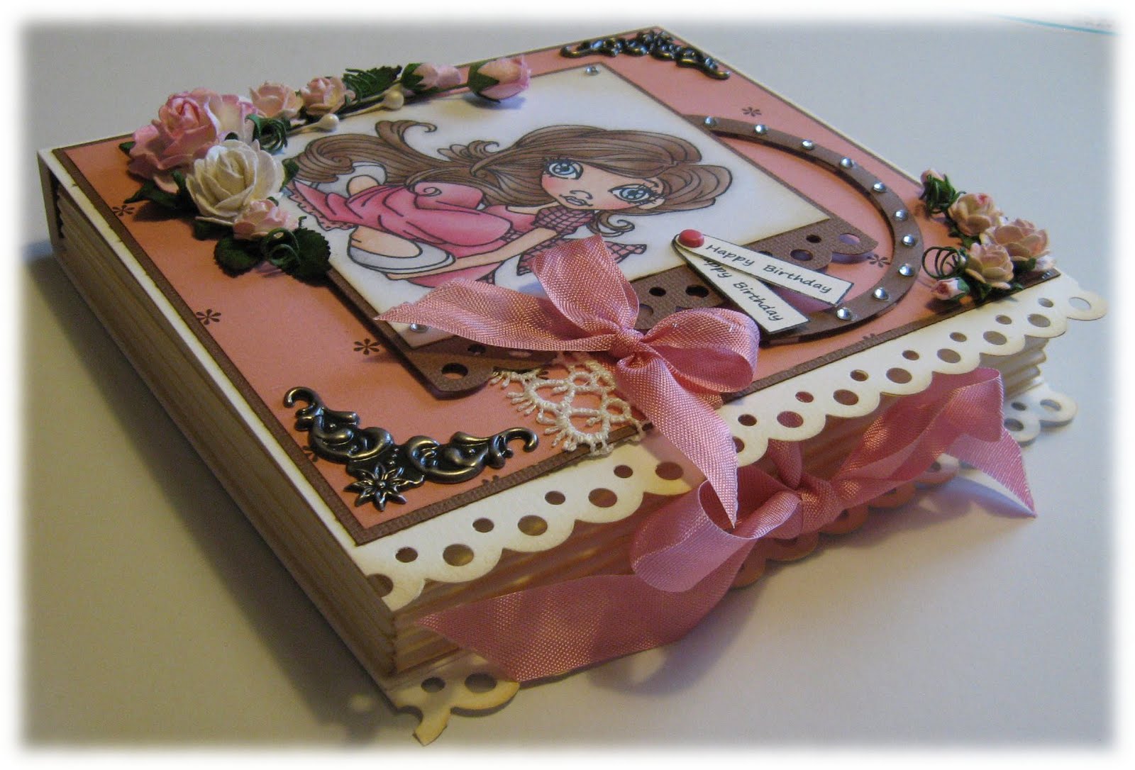 Here is my book box made for the sketch at The Sugar Bowl this time. Image is from Sugar Nellie and she's colored with ProMarkers and Prismacolors. Flowers are from WOC and I love Roses. I also used some ribbon and lace and some other embellies like the rhinestones to give a bit shine. All the edges are distressed with Distress Ink.